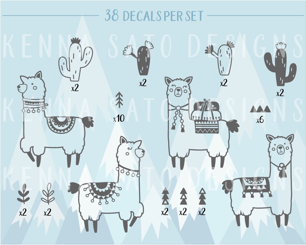 • One set has 4 alpacas and 34 other elements (cacti, trees, arrows) for a total of 38 decals
