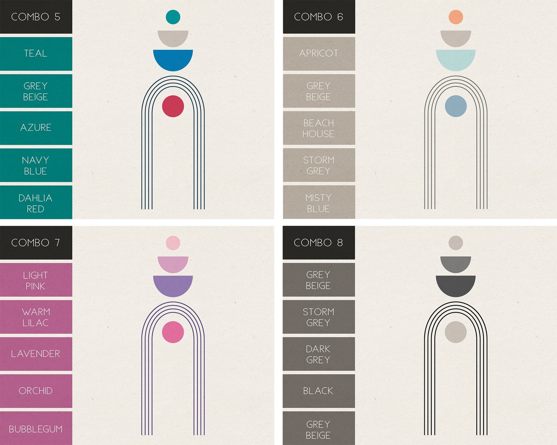 • To choose custom colors for this set, select "Custom Color Combo", and enter the colors you'd like in the "Order special instructions" field on the "Your cart" page before checkout. Be sure to specify which colors you want for the following elements: arch, small semi-circle, large semi-circle, small circle, and large circle.