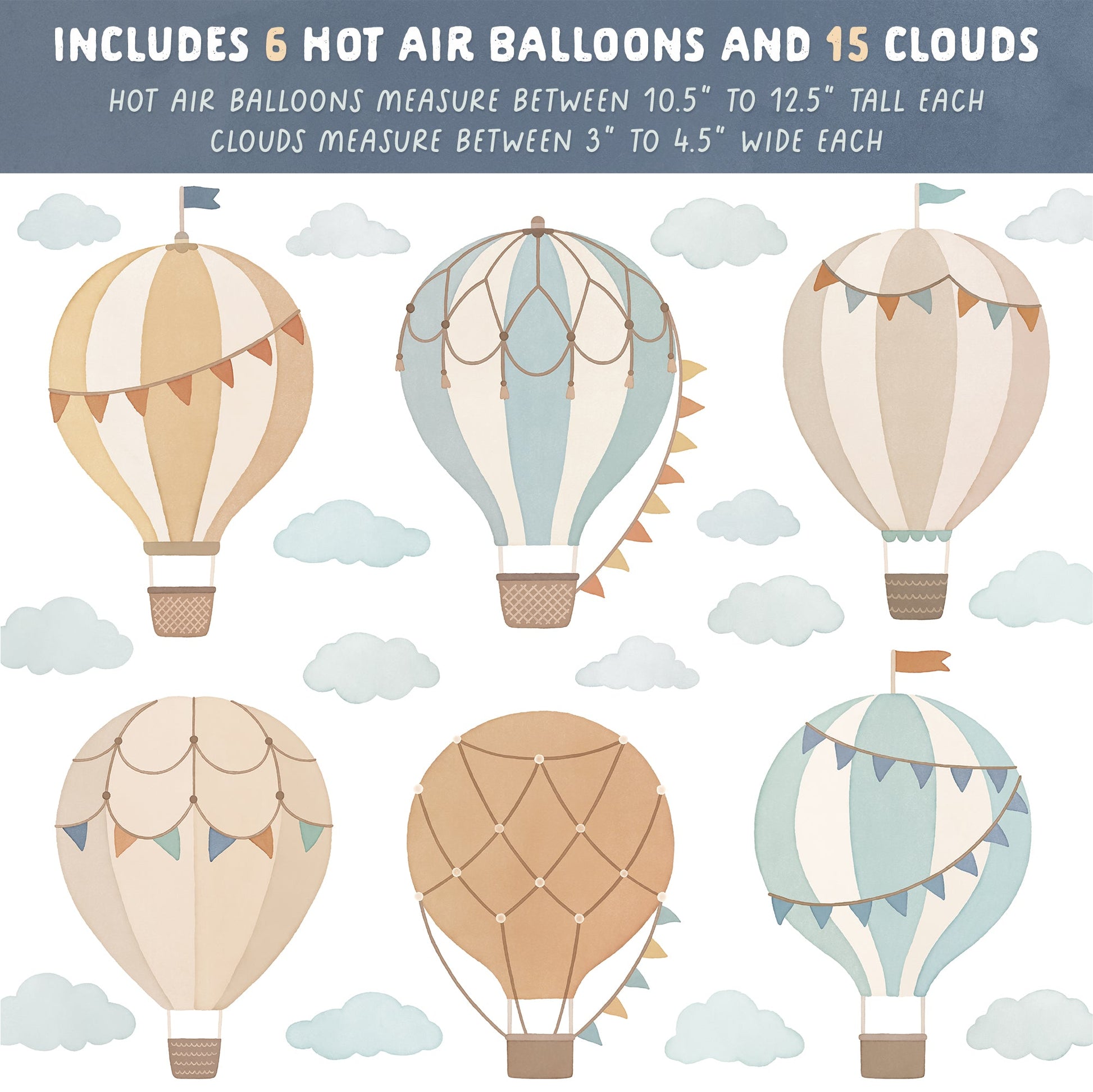 • Hot air balloons measure between approximately 10.5" to 12.5" tall each, clouds measure between approximately 3" to 4.5" wide each
