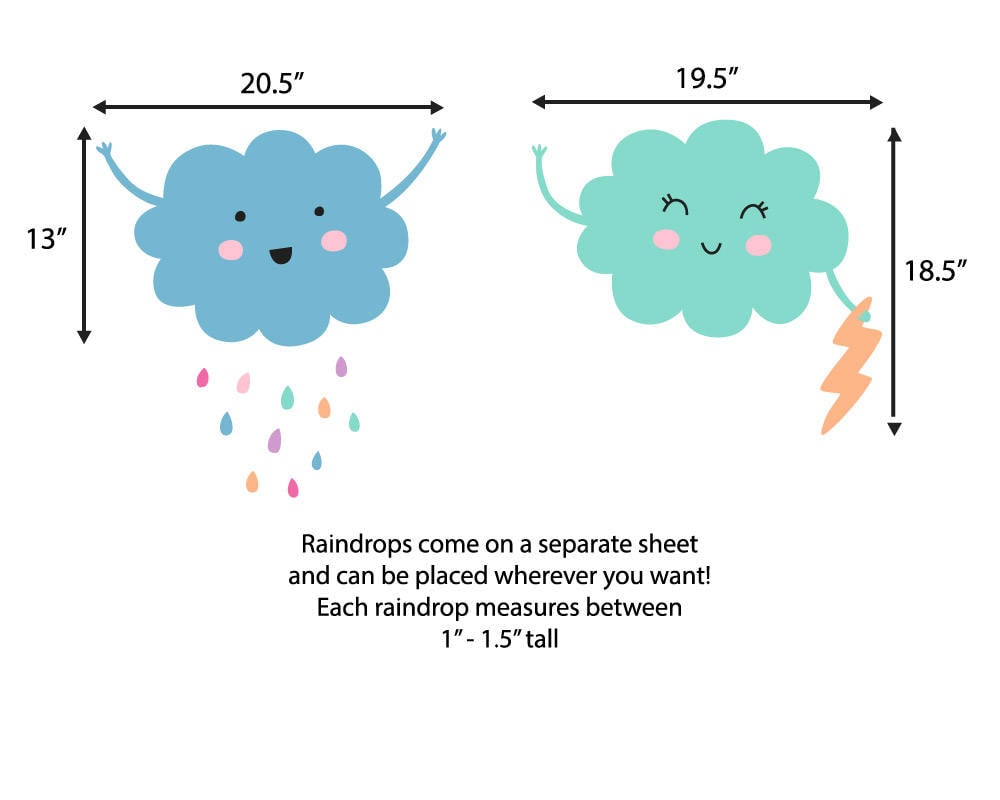 • "Sky Blue" cloud measures approximately 20.5" X 13", "mint" cloud holding lightning bolt measures approximately 19.5" X 18.5", and each raindrop measures between 1" - 1.5" tall