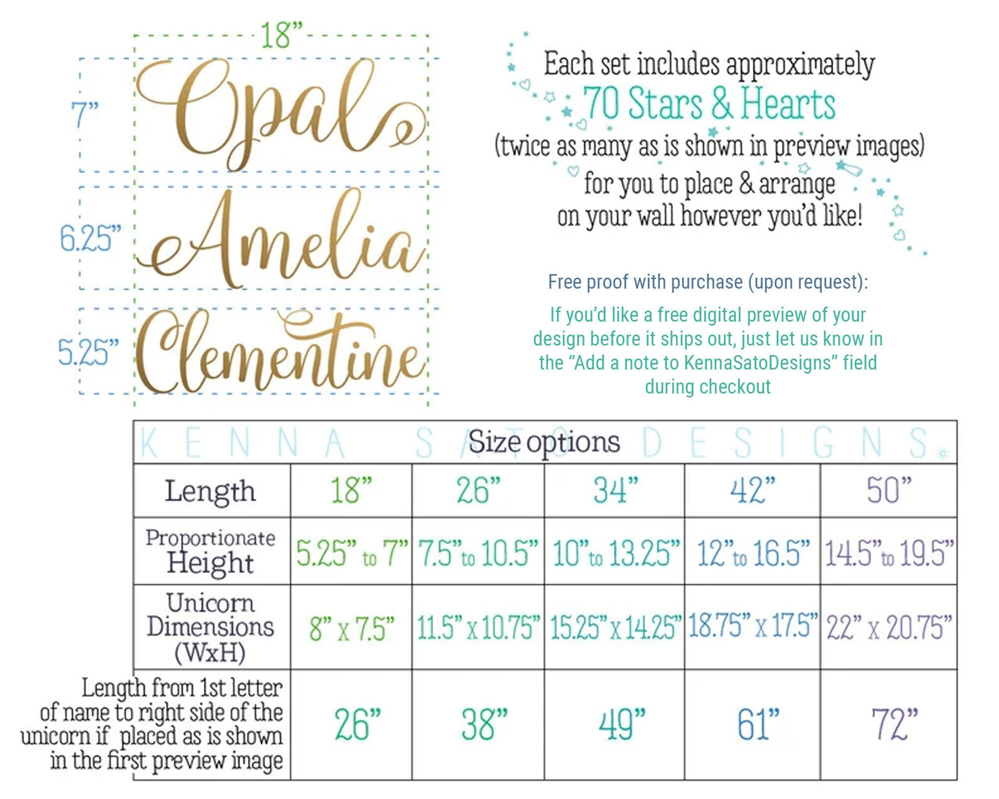 - Length from 1st letter of name to right side of unicorn if placed as shown in 1st preview image: 72"