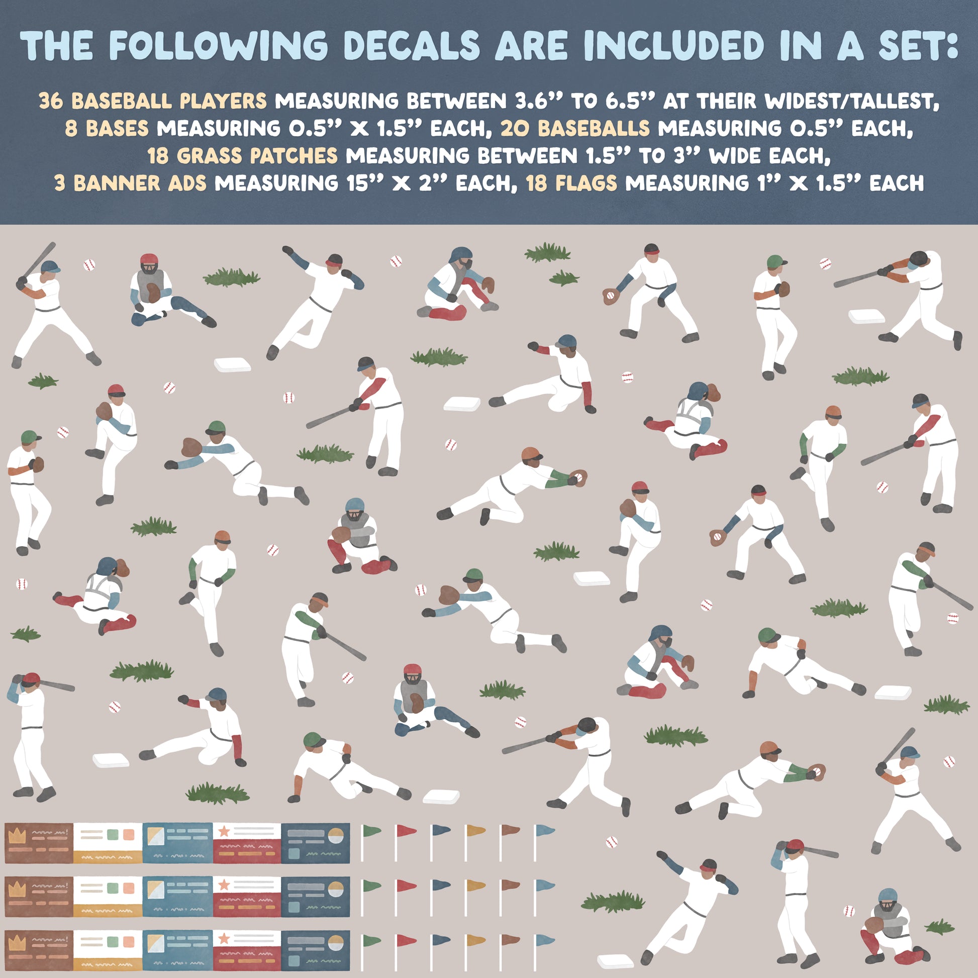 • Includes 36 baseball players (measuring between 3.5" to 6.5" at their widest/tallest), 8 bases (measuring 0.5" X 1.5" each), 20 baseballs (measuring 0.5" each), 18 grass patches (measuring between 1.5" to 3" wide each), 3 banner ads (measuring 15" x 2" each), and 18 flags (measuring 1" X 1.5" each)