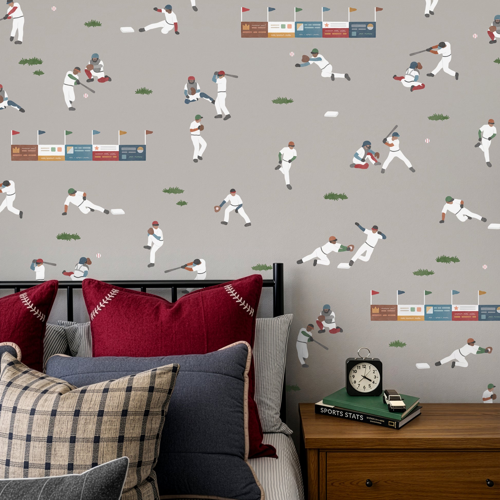 Batter up! With players on the field, grassy patches underfoot, and ballpark-style banner ads, this set brings all the excitement of game day right to your little slugger’s room!